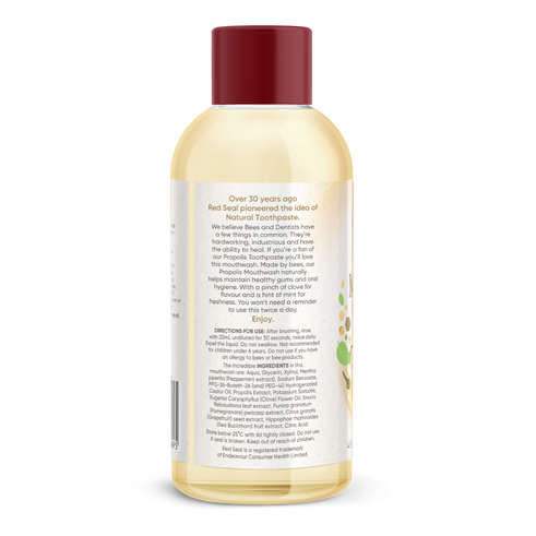 We believe bees and dentists have a few things in common. They're hardworking, industrious and have the ability to heal. If you're a fan of our Propolis Toothpaste, you'll love this mouthwash. Made by bees, our Propolis Mouthwash naturally helps support healthy gums and oral hygiene. With a pinch of clove for flavour and a hint of mint for freshness. You won't need a reminder to use this twice a day. Enjoy!