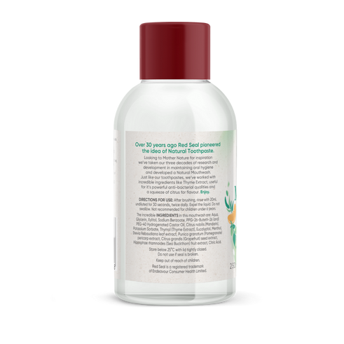 Over 30 years ago, Red Seal pioneered the idea of Natural Toothpaste. Looking to Mother Nature for inspiration we've taken our three decades of research and development in maintaining oral hygiene and developed a Natural Mouthwash. Just like our toothpastes, we've worked with incredible ingredients like Thyme Extract, useful for its powerful anti-bacterial qualities and a squeeze of citrus for flavour. Enjoy!