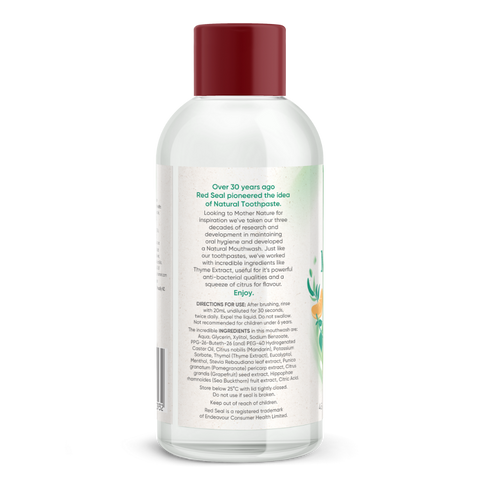 Over 30 years ago, Red Seal pioneered the idea of Natural Toothpaste. Looking to Mother Nature for inspiration we've taken our three decades of research and development in maintaining oral hygiene and developed a Natural Mouthwash. Just like our toothpastes, we've worked with incredible ingredients like Thyme Extract, useful for its powerful anti-bacterial qualities and a squeeze of citrus for flavour. Enjoy!