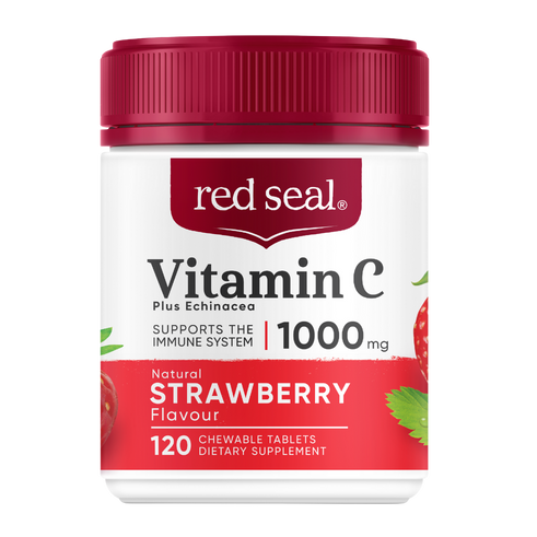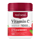 Red Seal 1000mg Vitamin C plus Echinacea with natural strawberry flavour chewable tablets, contains antioxidant support for the body's immune defences.