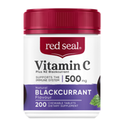 Red Seal 500mg Vitamin C chewable tablets with NZ Blackcurrant, contains antioxidant support for the body's immune defences.